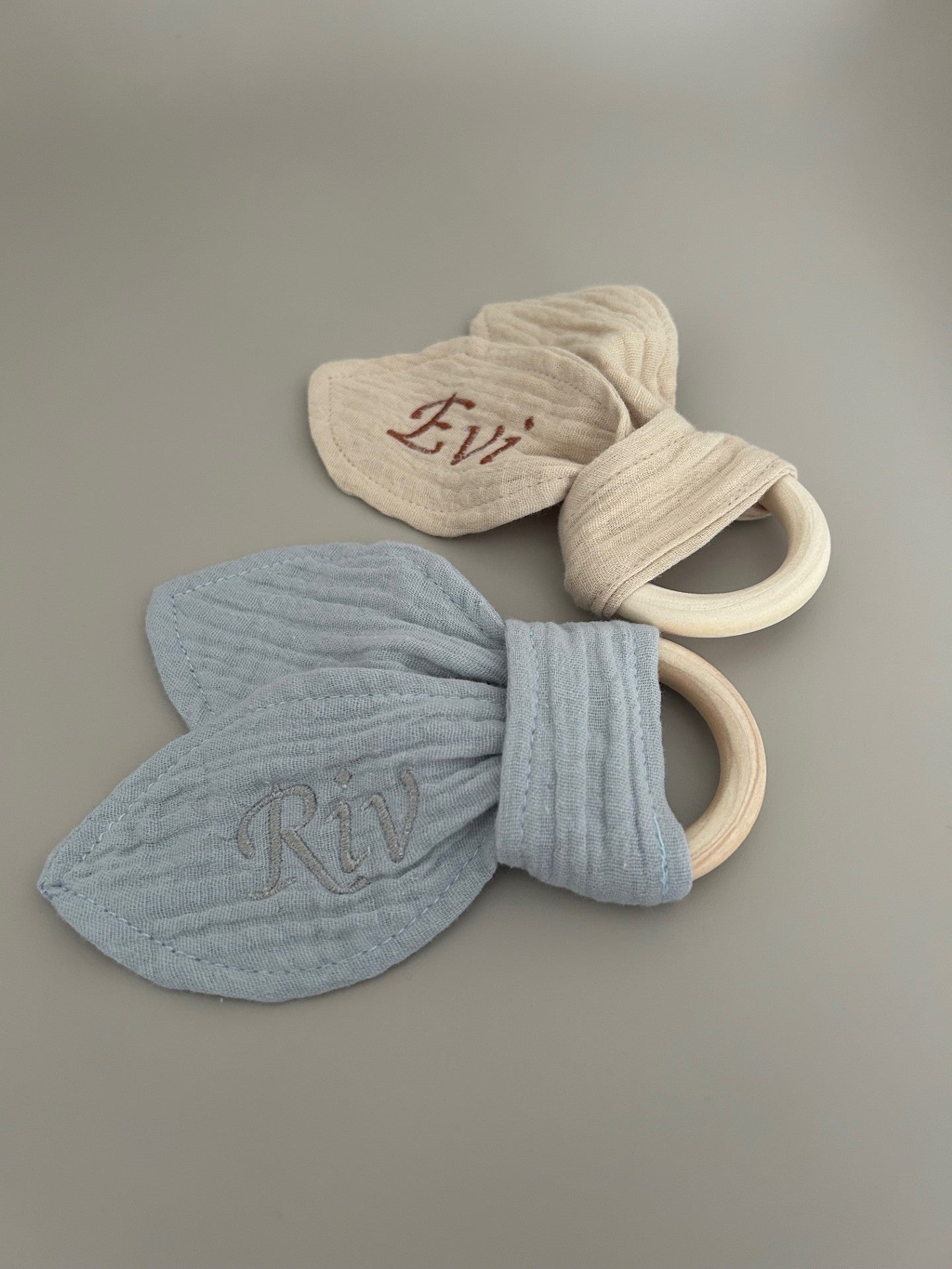 Onze leuke (gepersonaliseerde) bijtringen zijn te verkrijgen in twee kleuren.