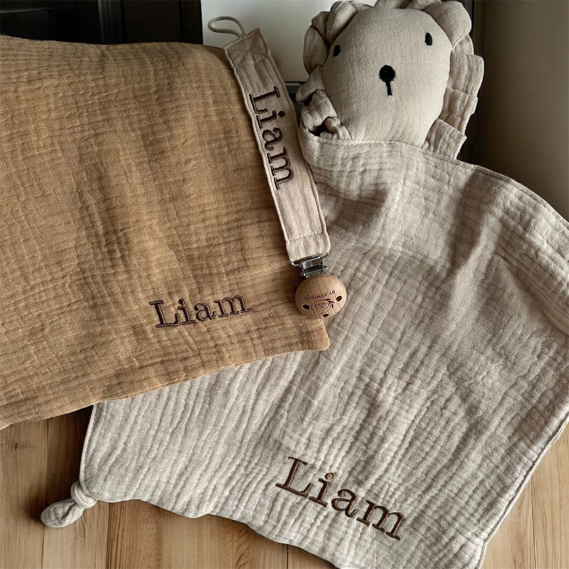 Deze leuke combi van een speenkoord en knuffeldoekje zijn verkrijgbaar in beige en blauw en te personaliseren met eigen naam.