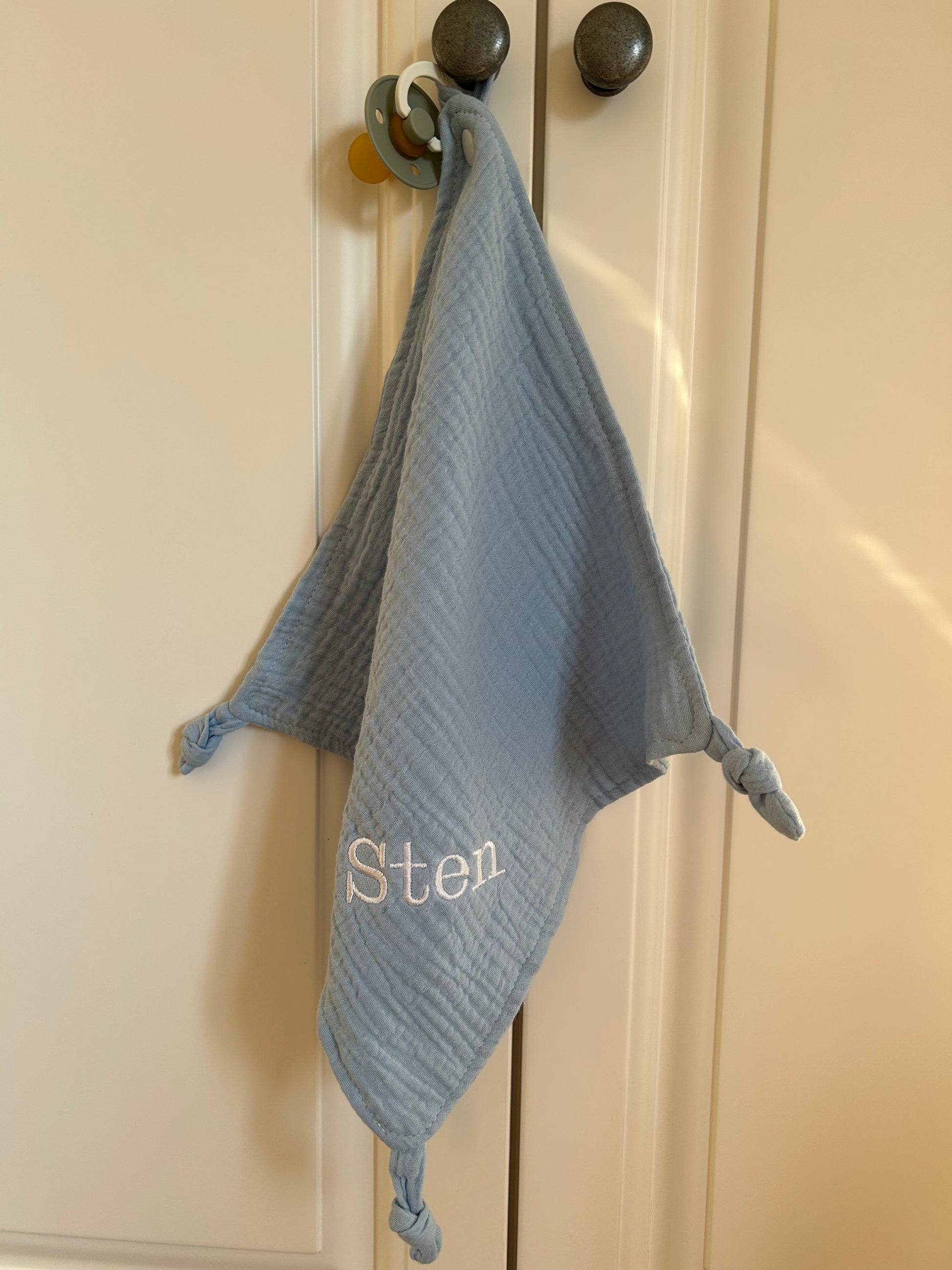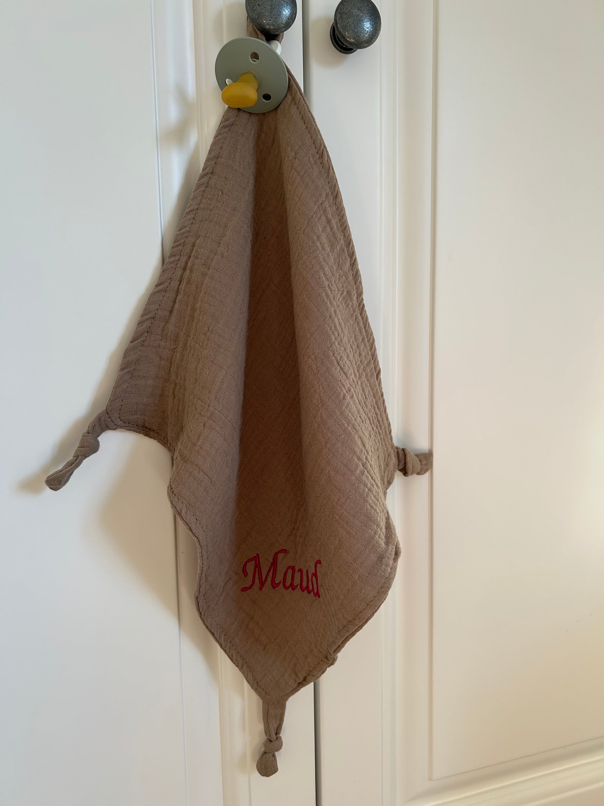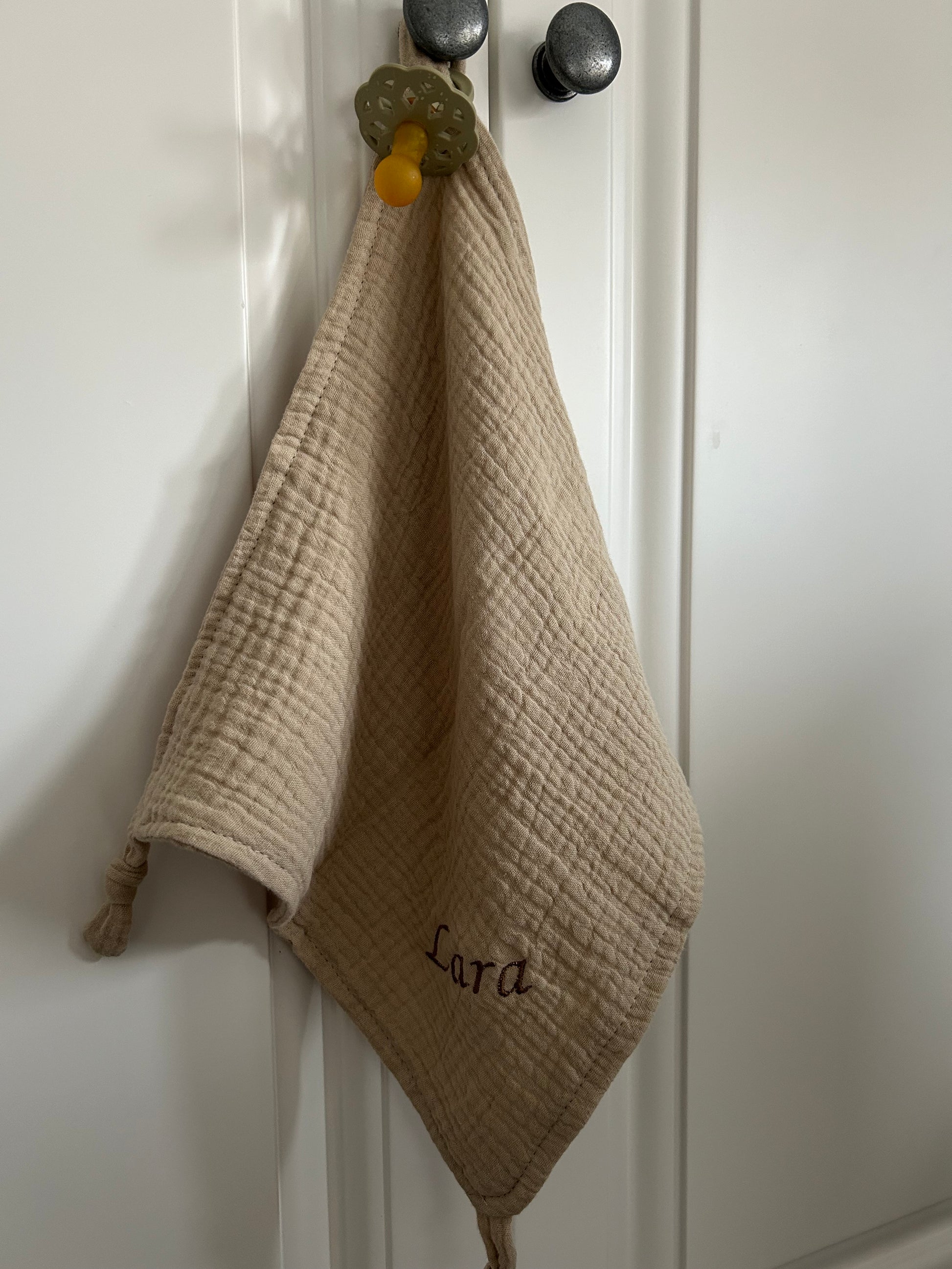 Laat het doekje nog persoonlijker maken met de naam van je kleintje, liefdevol geborduurd in fijne letters. Zo wordt het niet zomaar een accessoire, maar een kostbaar aandenken aan die eerste tijd samen.