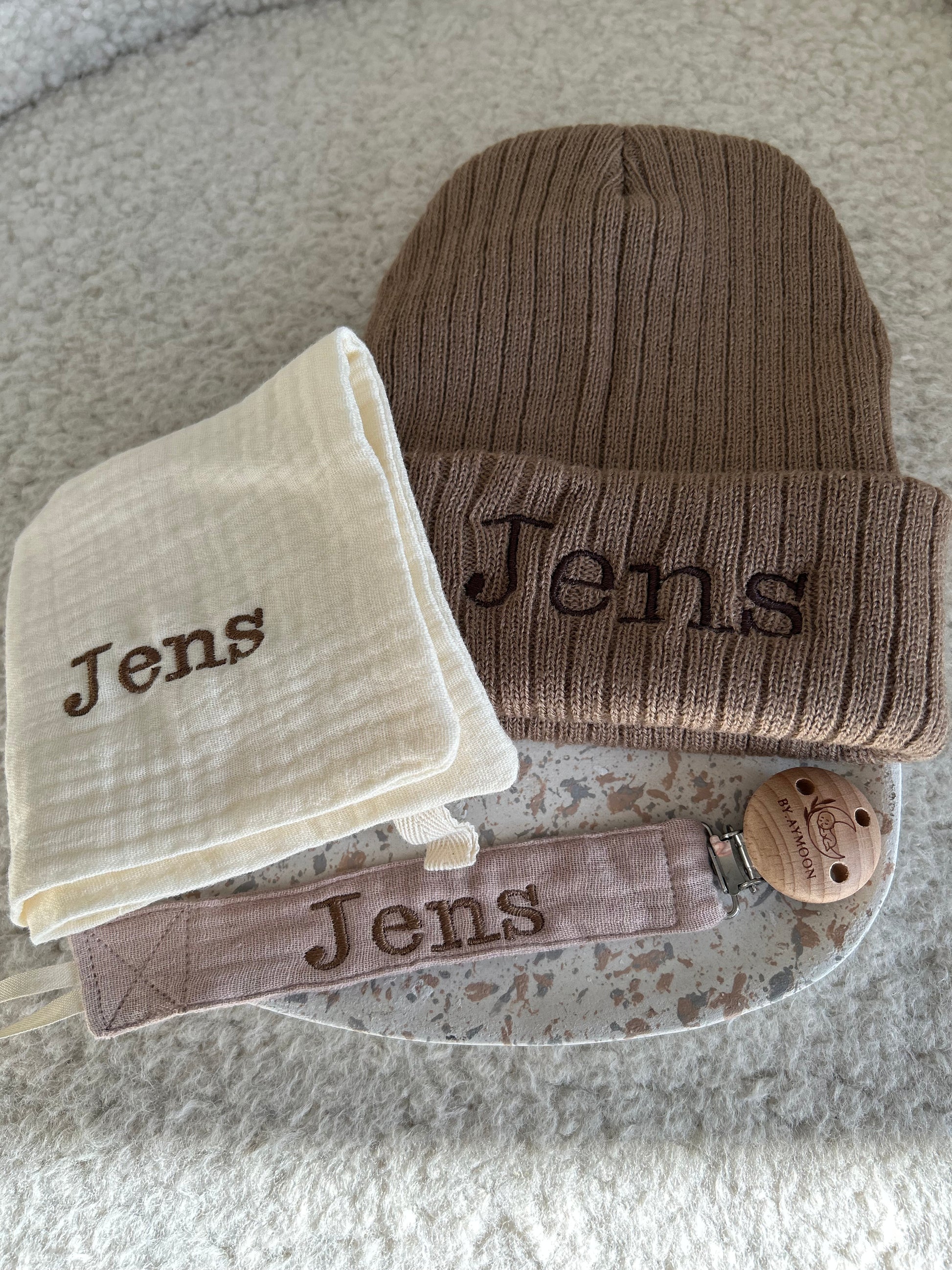 🧵 De naam is erop geborduurd.